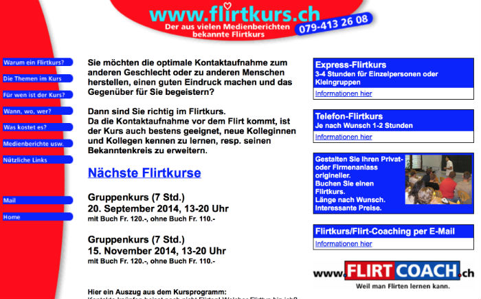 Fazit: Thomas Peter betreibt die Webseiten Flirtkurs.ch sowie Flirtcoach.ch und hat mit seinen Flirtkursen schon sehr viel Erfahrung. Das schafft Vertrauen. Außerdem gibt es unzählige Erwähnungen bis hin zu Erlebnisberichten in den Medien und im Internet nachzulesen. Die Resonanz ist sehr postitiv, was nicht weiter verwundert, da sich Thomas Peter intensiv mit den einzelnen Teilnehmern zu beschäftigen scheint. Die Internetseite bietet außerdem alle wichtigen Informationen. Thomas Peter ist eine Institution - empfehlenswert!